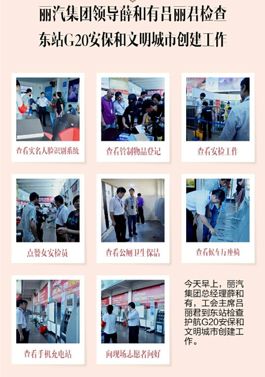 今天上午,麗汽集團總經理薛和有、工會主席呂麗君到東站檢查護航G20 安保和文明城市創(chuàng)建工作。