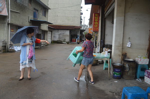 在一家早餐店門口,餐桌擺到了行車道上,呂主席上去勸導,老板立即把凳子搬到室內(nèi)