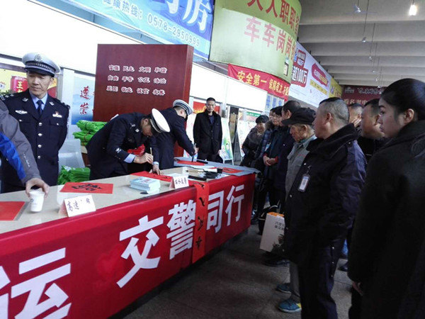 今天麗水市高速交警同志也給旅客帶來可驚喜,他們揮動手中的毛筆為旅客寫下一幅幅承載著吉祥、平安的春聯,旅客們拿著春聯露出幸福的笑容,為春運添上了一抹光彩。