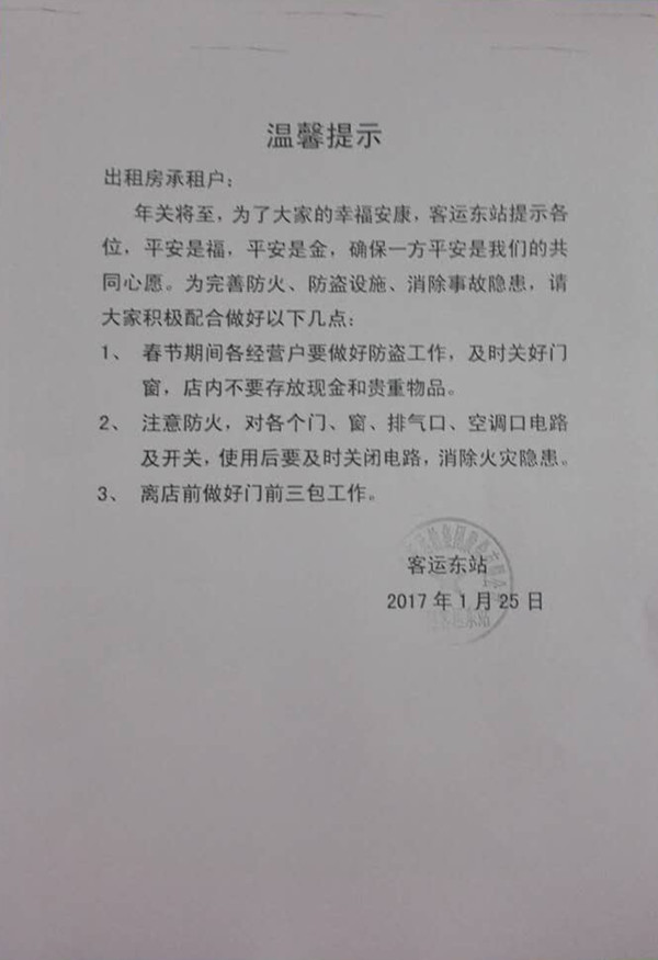一行人對東站站場和出租房的消防設施、用火用電情況進行了逐一檢查。要求工作人員加強安全防范,特別要注意春節期間的用火用電安全,下班后要及時切斷電源。并向周邊承租戶發出春節期間的溫馨提示,要求各承租戶在結束營業后對店內的用水、用電進行仔細檢查,確保消除安全隱患,平平安安、快快樂樂的過春節。