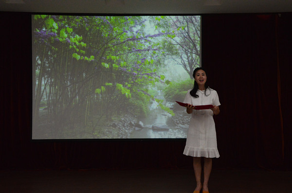 “從窗口望去,滿目蔥郁,一片綠海;柔疏條隨風搖曳,婆娑起舞;密葉團團簇簇,欣欣向榮”,自創詩歌《綠》通過選手對情境的描繪,仿佛讓聽眾置身于綠的海洋,看到了“綠水青山就是金山銀山”的美麗麗水,同時也揭開了比賽的序幕。