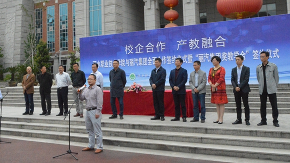 4月27日下午,麗水職業技術學院與麗汽集團的“校企合作”簽約儀式在麗水市職業技術學院隆重舉行,麗汽集團班子成員、相關部室及單位負責人和麗水市職業技術學院中層以上領導、相關專業負責人、學生代表近百人參加簽約儀式,標志著兩單位全面深入“校企合作”關系的正式建立。