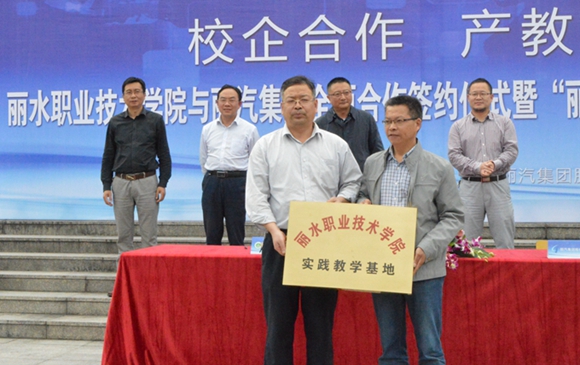下午2時55分,麗汽集團副總經理廖翊堯從麗水職業技術學院副院長李升陽手中接過“麗水職業技術學院實踐教學基地”牌匾。