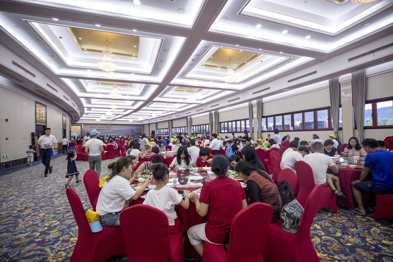 8月13日晚上,九城宴會(huì)中心熱鬧非凡,宴會(huì)大廳及休閑中廳擺滿(mǎn)了桌椅,紅色的桌椅布套顯得格外喜慶,酒店門(mén)前停滿(mǎn)了旅游大巴車(chē),進(jìn)店的游客排起了長(zhǎng)長(zhǎng)的隊(duì)伍,這是九城宴會(huì)中心自開(kāi)業(yè)以來(lái)接待的首場(chǎng)千人宴。