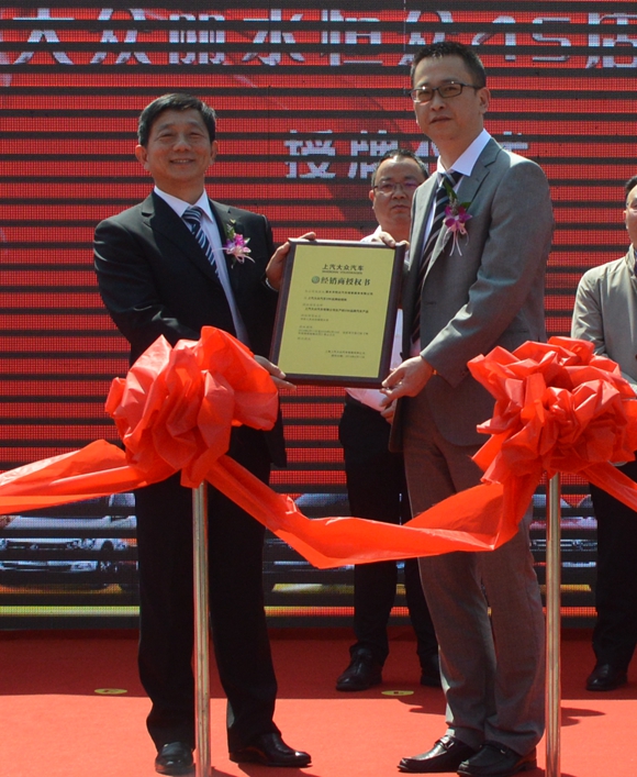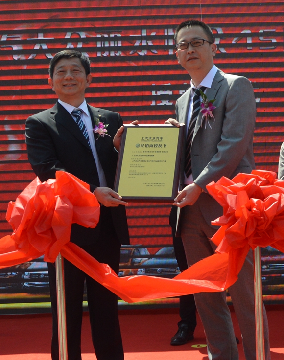 開業慶典儀式上,上汽大眾華東分銷中心副總經理張磊鄭重地將上汽大眾汽車經銷商授權牌匾交到麗水市恒眾汽車銷售服務有限公司董事長何赤詮手上。
