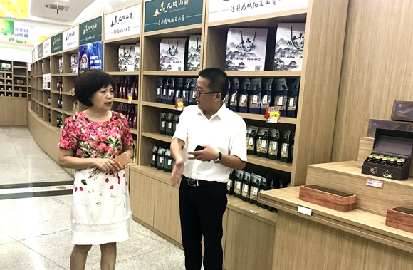 陳紅艷主席一行先在九城山貨大賣場進行了參觀體驗,余雷經理在陪同過程中重點就賣場情況、麗水山耕品牌系列產品和賣場的進出口商品銷售優勢進行了詳細介紹。陳紅艷主席一邊聽取介紹,一邊詢問各類產品細節,還現場體驗了山茶油護膚產品。并拿出手機打開麗汽集團微信會員系統查看了自己的會員權益,向賣場工作人員說道:“打完折后的價格還是很吸引人的!”
