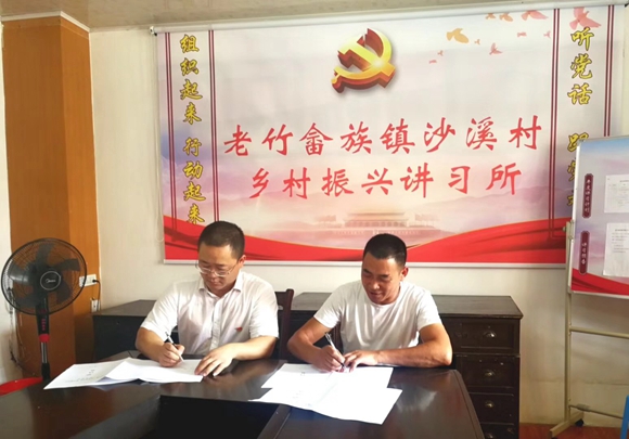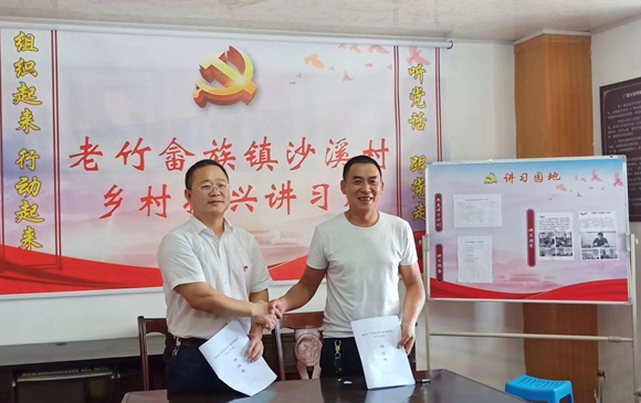 麗汽集團黨委書記、董事長葉茂和沙溪村黨支部書記藍紅星分別代表麗汽集團和沙溪村簽署“村企合作”協(xié)議。
