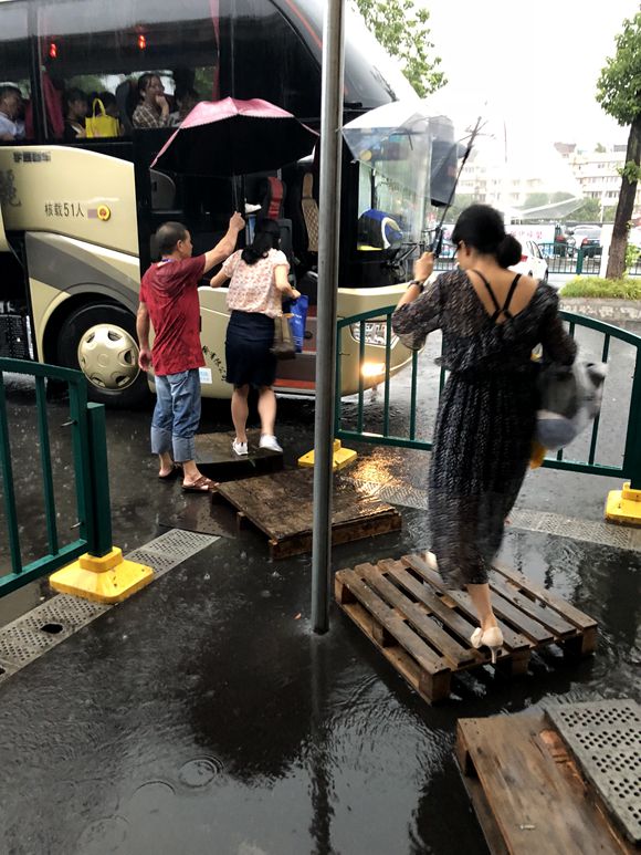 中秋佳節(jié)前夕,午后一場突如其來的滂沱大雨,地面積水一下子沒到了腳踝處,將麗水高鐵站的上車點(diǎn)堵住了。從高鐵下車轉(zhuǎn)乘客車的旅客上車成了一個(gè)大難題,幾位女乘客躍躍欲試,立刻又縮了回來。