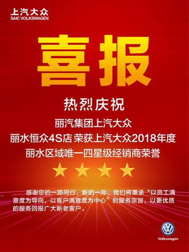 麗水恒眾公司在全國一千多家經(jīng)銷商中脫穎而出,喜獲“上汽大眾四星級經(jīng)銷商”榮譽稱號 。麗水恒眾公司開業(yè)首年就能取得如此成績實屬不易,2018年公司在全體員工的共同努力下,新車銷售量、售后服務(wù)臺次、客戶滿意度、DCDA檢查、售后AuditⅡ檢查均達到廠家要求的四星標準。這是對恒眾全體員工2018年各項工作的肯定和勤懇工作的回報。