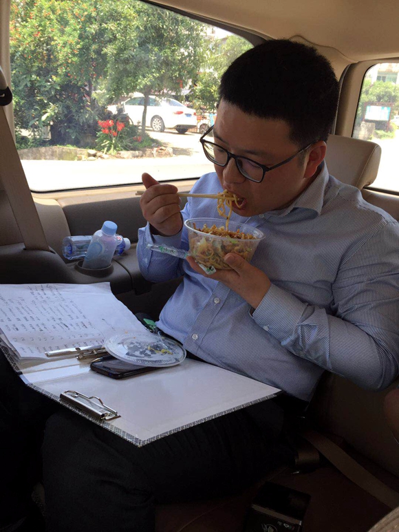 時(shí)間在忙而有序中過了飯點(diǎn),注重細(xì)節(jié)的他,卻無暇顧及了自己的午飯,還是身邊的同事提醒到吃飯了,他才想起了這個(gè)茬。沒見他收拾收拾準(zhǔn)備下班,而是一頭鉆進(jìn)了車后座,端起了一碗早已冷卻的外賣炒面,扒拉了起來,眼睛卻一直離不開懷里的工作簿。同事打趣地說:勇哥,今天上班賺了加班費(fèi),還吃的這么省啊?引起一片哄笑……高勇抬起頭笑了笑,“冷面好吃!我得趕緊吃完,客人還等著我送發(fā)票呢!”