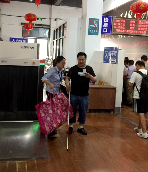盲人旅客聽著劉遠玲走開的聲音,很激動的對我說:“你們站的工作人員真好,從我一進車站就過來扶著了。現在又幫忙買票。真好,真好……”話剛落,劉遠玲買好票遞了過來,“13:06分了,你先幫他把票檢了,我現在扶他出去等車,這樣時間剛剛好。”