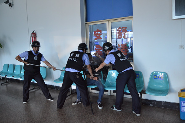 (科目二:反恐演練)一名青年男子在過安檢時被查出包內攜帶一把管制刀具,安檢員上前檢查時該男子拒絕配合,同時揮舞起刀具往候車大廳逃跑。業務站值班人員立刻通過廣播通知旅客不要慌張,同時疏散遭受驚嚇的旅客。保衛科立即報警,并向值班科長匯報,保衛科反恐應急人員攜帶反恐器材火速趕到現場,大聲呼喝讓其放下刀具,一面盾牌迎面頂上,該男子被逼到墻角,另一位隊員用鋼叉迅速將目標固定,趁其慌亂之際,防暴棍準確的砸在男子手腕上,兇器應聲掉落,另一名隊員一腳踢開刀具,三人合力,將兇徒控制住,扭送給趕到的公安民警。