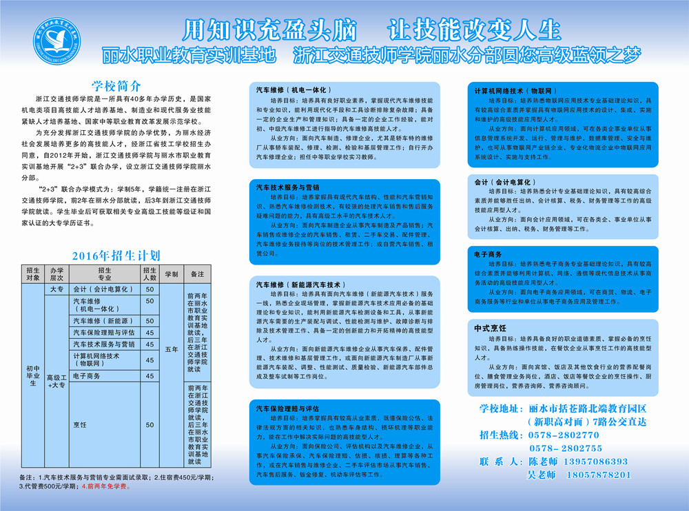 麗水教育實訓基地 浙江交通技師學院麗水分部2016年招生計劃