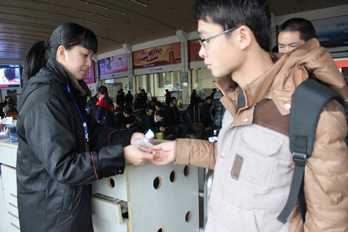 趙妍正在認(rèn)真地為每位旅客檢票。