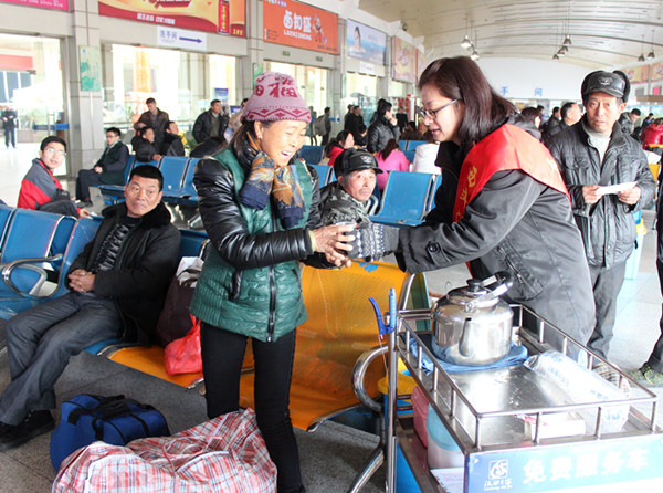 服務班的陳燕早早的推著服務車在候車室服務,為春運第一天踏上回家旅途的人們免費送上一杯杯熱氣騰騰的開水。陳燕說,為旅客服務是她的本職工作,農民工兄弟們在外工作了一年才回一趟家,她和姐妹們要盡自己所能,為他們提供最優質的服務。服務班已備好了生姜茶,隨著氣溫的下降,姐妹們將會推車送姜茶服務,為他們回家的途中送上一抹溫暖。