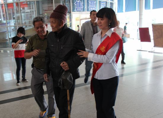 4月30日下午15:30時分,一位八十多歲的老人在五十多歲的兒子攙扶下,拄著拐杖顫顫悠悠的來到客運西站,準備乘車回慶元老家休養。服務班工作人員李愛秧眼捷手快,立刻迎上前幫扶。