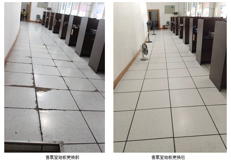 客運西站主樓一層售票室和消防監控室的防靜電地板因使用多年,破損嚴重,影響了西站整體的美觀。為了保持西站良好的窗口形象和符合創建國家衛生城市的要求,近日,西站對售票室和消防監控室的防靜電地板進行更新。
