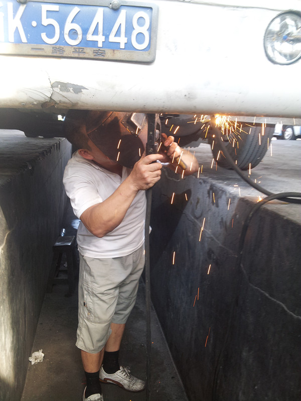 客長運分公司修理工陳勇軍師傅正在進行電焊作業,灼眼的火星、淺藍的焊霧、嗆鼻的氣味彌漫維修車間