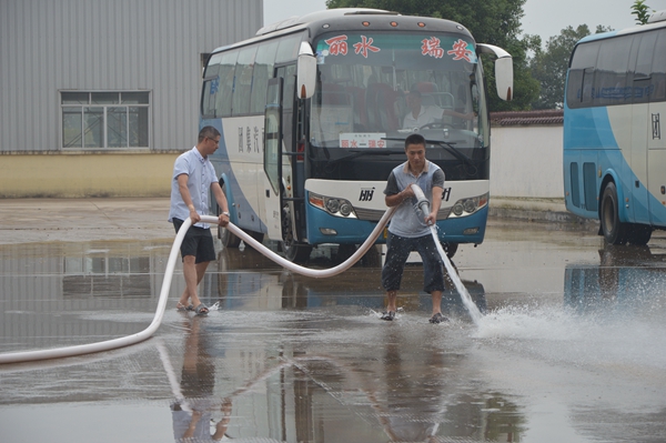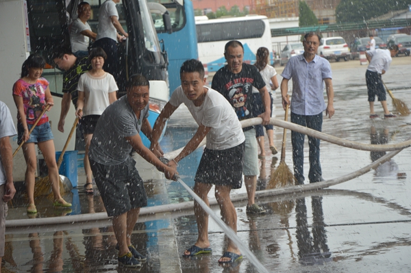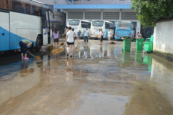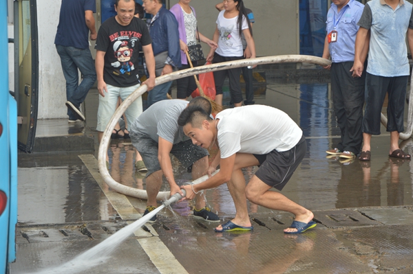 長運公司修理車間、調(diào)度室等昨天也受到了重創(chuàng)。一大早,修理工師傅們早已拿起水槍,打掃修理車間;員工們開始沖洗辦公場地。