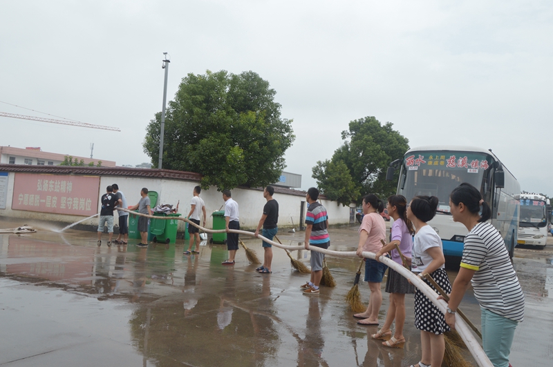 旅游集散的青年隊伍來了,經(jīng)理葉劍飛和員工們一道正起勁地沖洗著候車室。