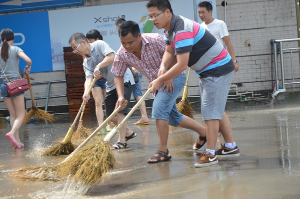 機關(guān)本部的救援隊伍來了,一個個掄起掃把,沒有過多的語言,用實際行動立馬參與到救援當中。