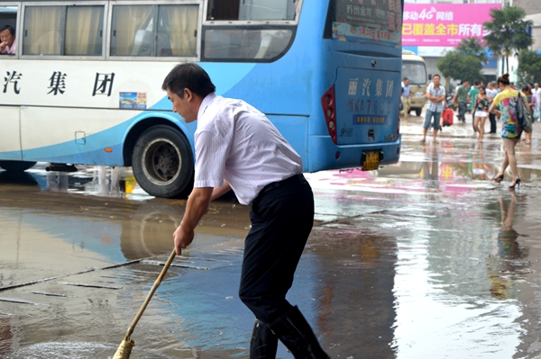 東站的站場上,到處是兄弟單位救援人員的身影。有的參與到電力搶修、有的維護秩序、有的引乘導(dǎo)乘,大部分人參與到清掃站場中:前面人員拉起消防帶、把好水槍,沖到哪片淤泥,后面人員就掄起掃把跟到哪,快速把污泥、污水沖掃到陰溝里,配合得恰當好處。烈日下,個個揮汗如雨,濕透了衣服,有的赤著腳,有的索性光著膀子。水槍沖到哪,掃到哪,身后留下一片片潔凈的場地。