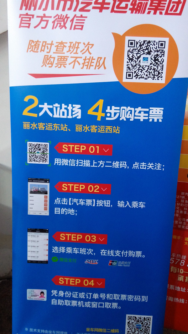 為方便旅客出行,強化服務質量,麗汽集團在開通網上售票、電話售票后,今天上午又推出服務新舉措--開通微信售票。廣大旅客只要掃描關注麗汽集團的微信號、點擊“汽車票”按鈕輸入乘車目的地、選在所乘的班車并在線支付,購票成功后旅客就可以憑身份證或訂單號和取票密碼到你購票時選擇的乘車站(東站、西站)的自助取票機或窗口打印出相應車票,即可憑票乘車。