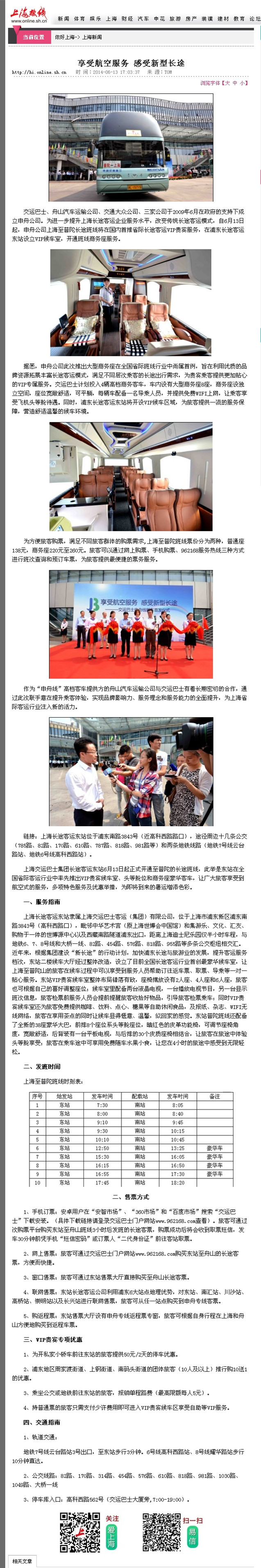 2014年6月13日起,國內交運巴士上海至普陀的申舟長途班線,在國內首推長途客運VIP貴賓服務,在浦東客運東站設立VIP候車室,開通類似于飛機頭等艙的班線商務座服務,以滿足不同層次乘客的長途出行需求。據了解,交運巴士投入4輛高檔商務客車,車內設有大型商務座8座,商務座設獨立空間,座位寬敞舒適且可平躺,后背裝有平板電視,每輛車配備一名導乘人員,并提供免費WIFI上網。同時,浦東客運東站也設置了目前全國長途客運行業最豪華的VIP候車區域,讓旅客在候車過程中享受到服務人員幫助訂往返車票、取票、導乘等一對一的貼心服務。同時在細節上也極為細致,例如為開私家小轎車前往東站的旅客提供50元/2天的停車優惠、浦東地區周家渡街道、上鋼街道、南碼頭街道的團體旅客(10人及以上)推行購10送1的優惠等。