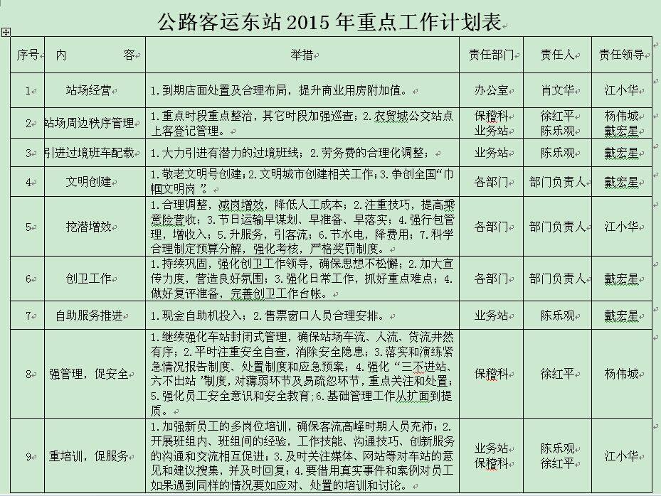 根據《集團公司董事會工作報告》經營目標及戰略重點,緊密結合東站工作實際,客運東站制定2015年重點工作計劃,重點做好九項工作: