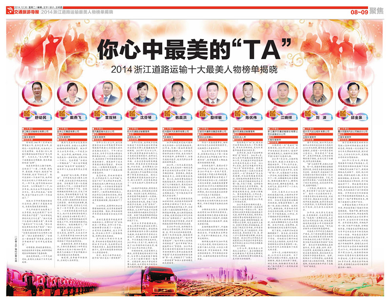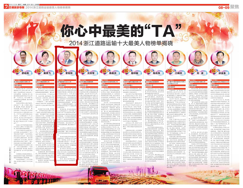 “2014年度浙江道路運輸十大最美人物”,涵蓋了全省11個地市的一線執法、窗口、行政人員,貨運經理人,客運、出租車、公交司機等工種,拼出了浙江道路運輸行業“最美方向盤”圖譜。章雙林有幸成為麗水唯一入選的最美人物。