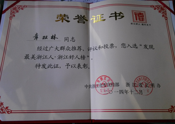 “發(fā)現(xiàn)最美浙江人--浙江好人榜”推薦評(píng)選活動(dòng)由省委宣傳部、省文明辦聯(lián)合開展,每月推薦評(píng)選一次,旨在為大力培育和弘揚(yáng)社會(huì)主義核心價(jià)值觀,積極普及和踐行當(dāng)代浙江人共同價(jià)值觀,進(jìn)一步深化“發(fā)現(xiàn)‘最美浙江人’、爭(zhēng)做‘最美浙江人’”主題宣傳實(shí)踐活動(dòng),健全和完善“浙江好人”選樹和培育機(jī)制,推動(dòng)“最美”從“盆景”變成“風(fēng)景”、從“風(fēng)景”變?yōu)椤帮L(fēng)尚”。推薦評(píng)選分為助人為樂類、見義勇為類、誠(chéng)實(shí)守信類、敬業(yè)奉獻(xiàn)類和孝老愛親類五個(gè)類別。評(píng)選活動(dòng)經(jīng)過網(wǎng)絡(luò)投票、群眾評(píng)議、專家評(píng)審等環(huán)節(jié),12月份共評(píng)選出25名浙江好人,章雙林入選見義勇為類浙江好人。
