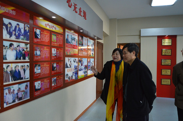 在麗汽集團榮譽室,工會主席呂麗君向李良福副廳長介紹涌現(xiàn)出的各類先進典型